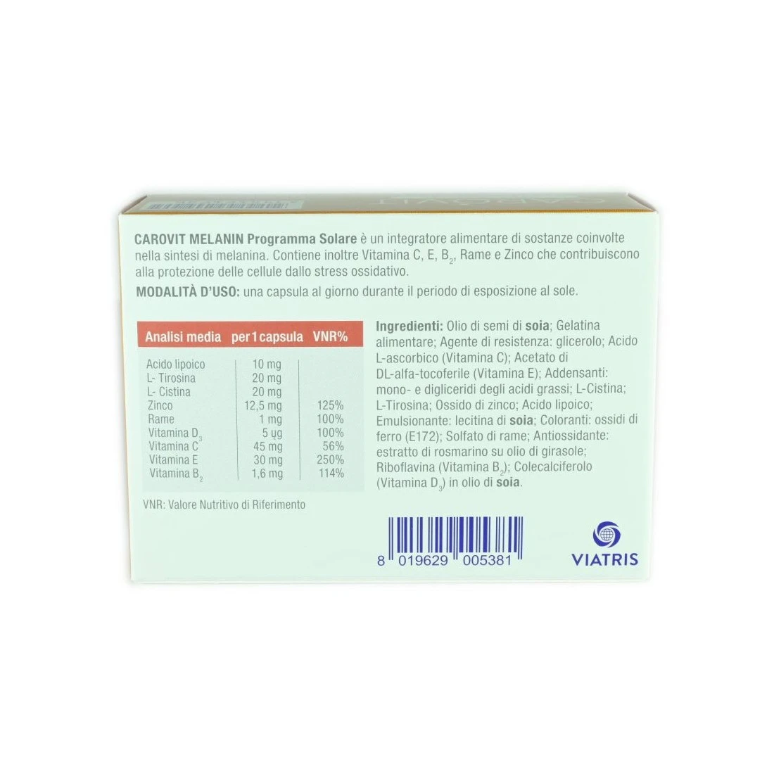 Integratore alimentare di sostanze coinvolte nella sintesi di melanina. Contiene inoltre vitamina C, E, B2, rame e zinco che contribuiscono alla protezione delle cellule dallo stress ossidativo.