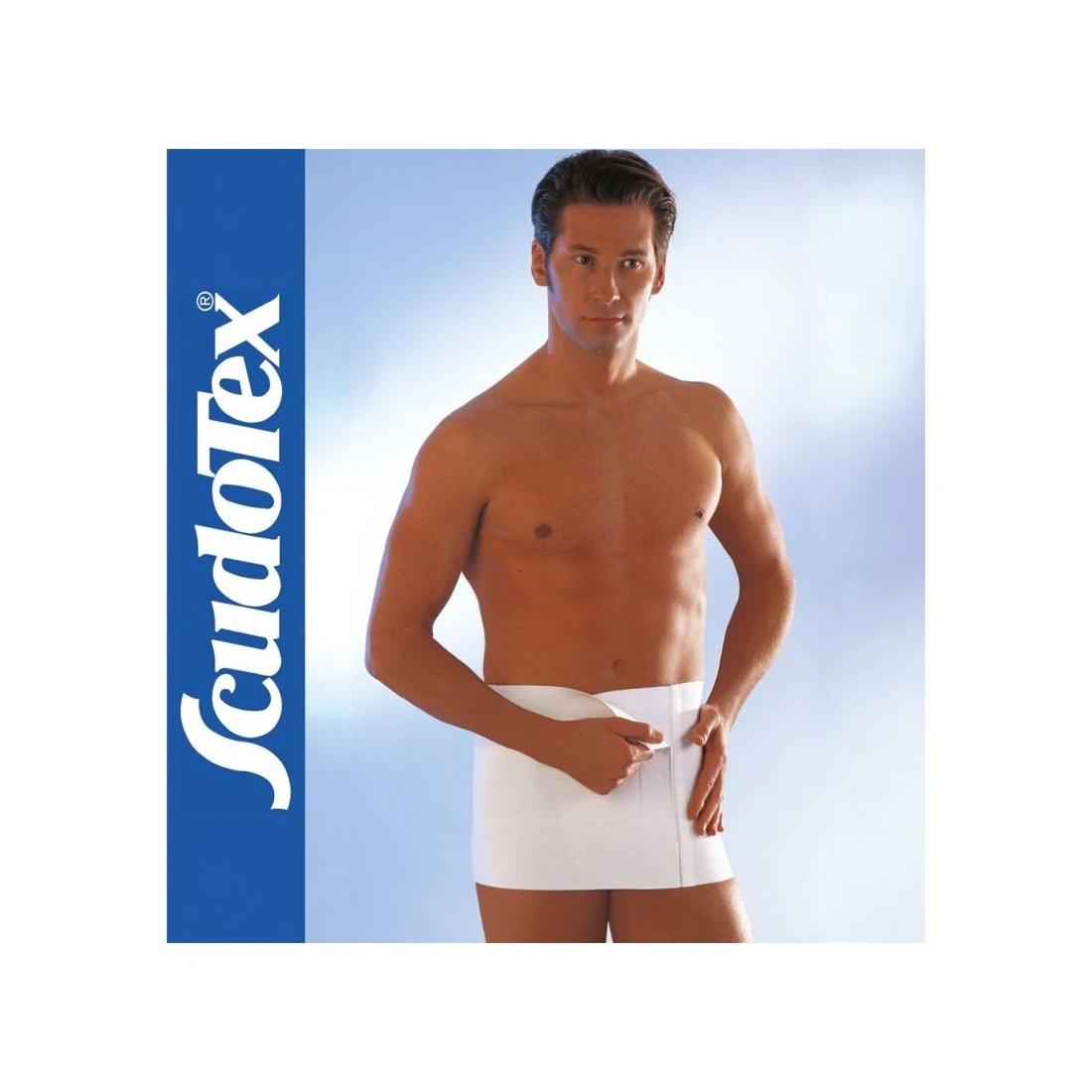 Cintura elastica dotata di ampio pannello adesivo regolabile foderato in puro cotone. Speciale tessuto ad elasticità differenziata, con maggiore forza nella parte centrale, che ne accresce l’azione contenitiva. Bianca.