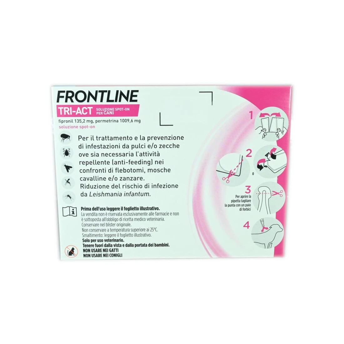 Soluzione spot on repellente, insetticida e acaricida per il cane. Grazie ai suoi principi attivi, Fipronil e Permetrina, è un prodotto mirato per il trattamento e la prevenzione di infestazioni da pulci e zecche. Repellente contro pappataci, zanzare, zecche e mosche cavalline.
