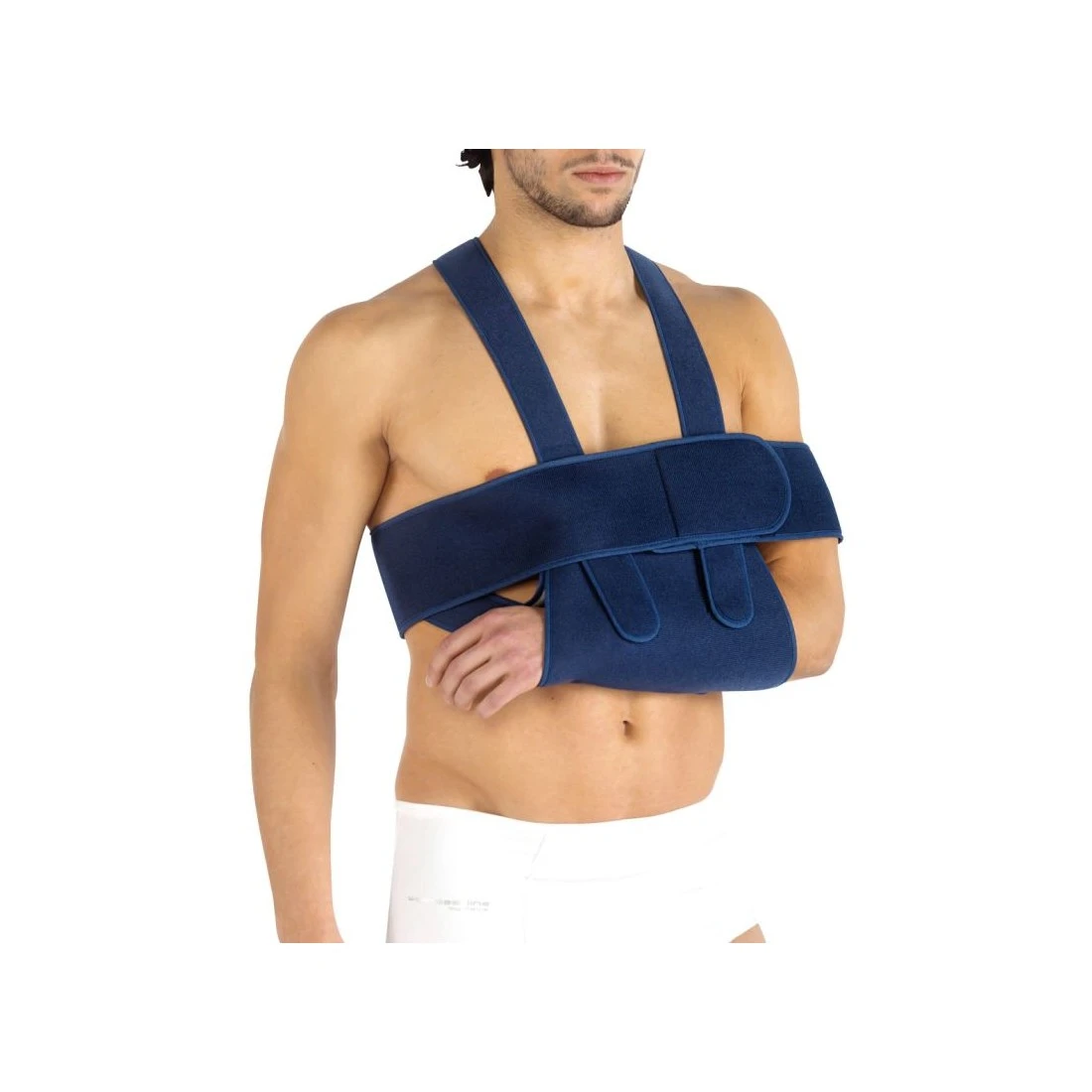 Costituito da un confortevole supporto per il braccio e da una fascia toracica, dotata di chiusura a velcro, che lo sovrappone e lo blocca. Completamente apribile. Le lunghezze dei tiranti sono personalizzabili e regolabili.