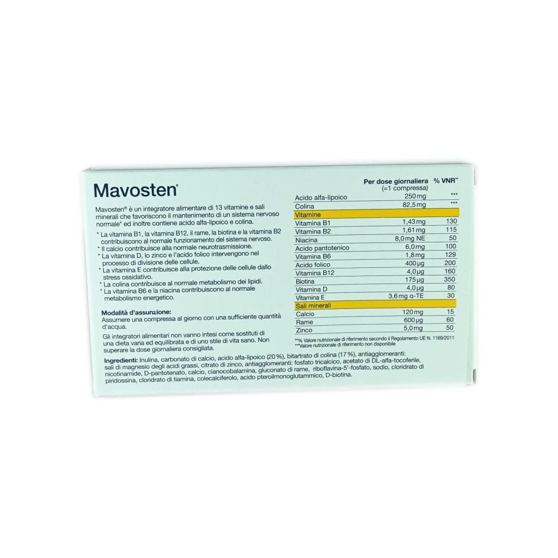 Complesso intelligente con micronutrienti a supporto della salute dei nervi. Con 13 micronutrienti selezionati, acido alfa-lipoico e colina. Tutti gli ingredienti contenuti in Mavosten svolgono un ruolo fondamentale per la salute dei nervi agendo in sinergia.