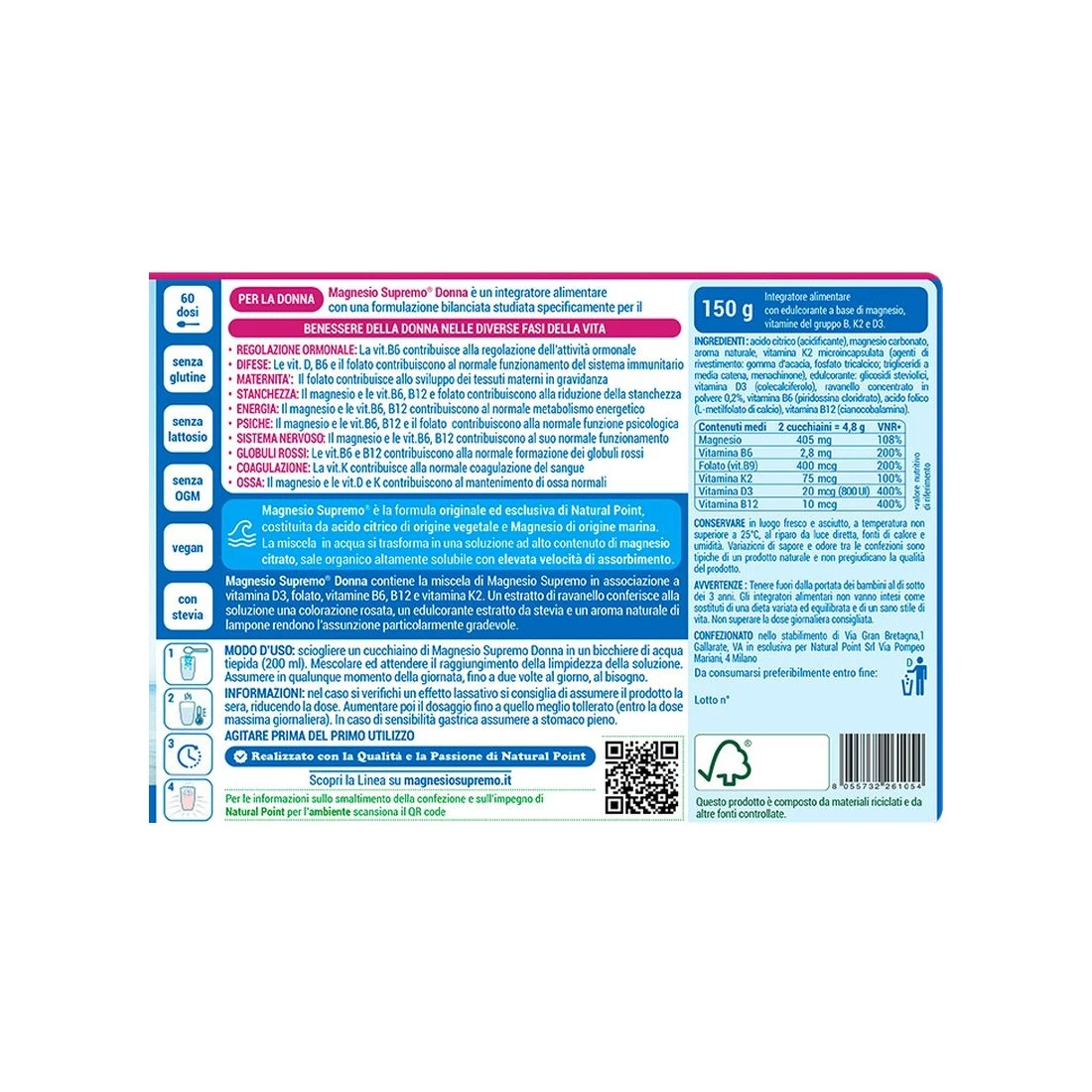 integratore alimentare studiato per il benessere generale della donna, infatti apporta gli ingredienti adatti per soddisfare le esigenze comuni nelle diverse fasi della vita. Contiene magnesio, le vitamine B6, B9, B12, K2 e D3.