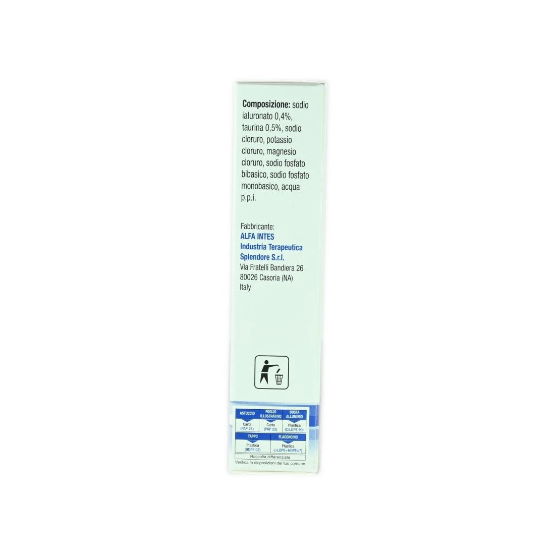 Sostituto lacrimale ipotonico e molto viscoso a base di una dose elevata di acido ialuronico (0,4% ) e taurina (0,5%) con la presenza di sali come magnesio e potassio.