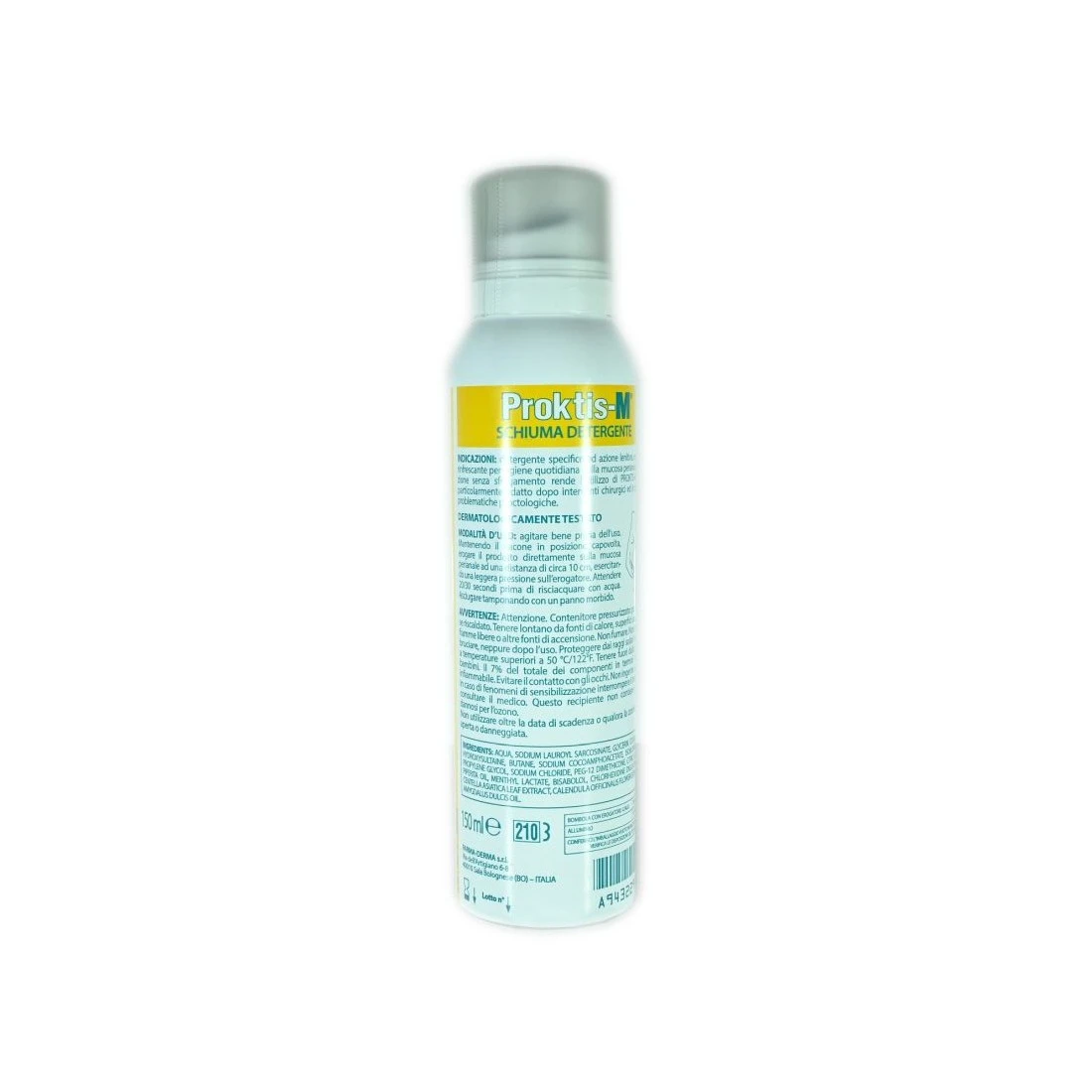 Detergente specifico ad azione lenitiva, emolliente e rinfrescante per l’igiene quotidiana della mucosa perianale. L’applicazione senza sfregamento rende l’utilizzo di PROKTIS-M schiuma particolarmente adatto dopo interventi chirurgici ed in presenza di problematiche proctologiche.