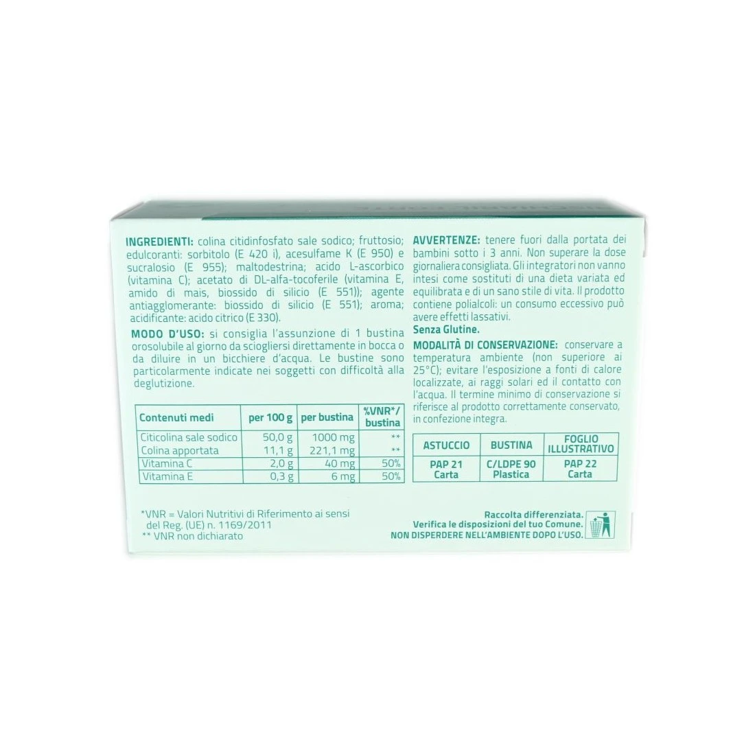 Integratore Alimentare a base di Citicolina sale sodico 1000 mg (di cui colina 221,1 mg), vitamina C e vitamina E. Integratore alimentare indicato in caso di confusione ed affaticamento mentale.