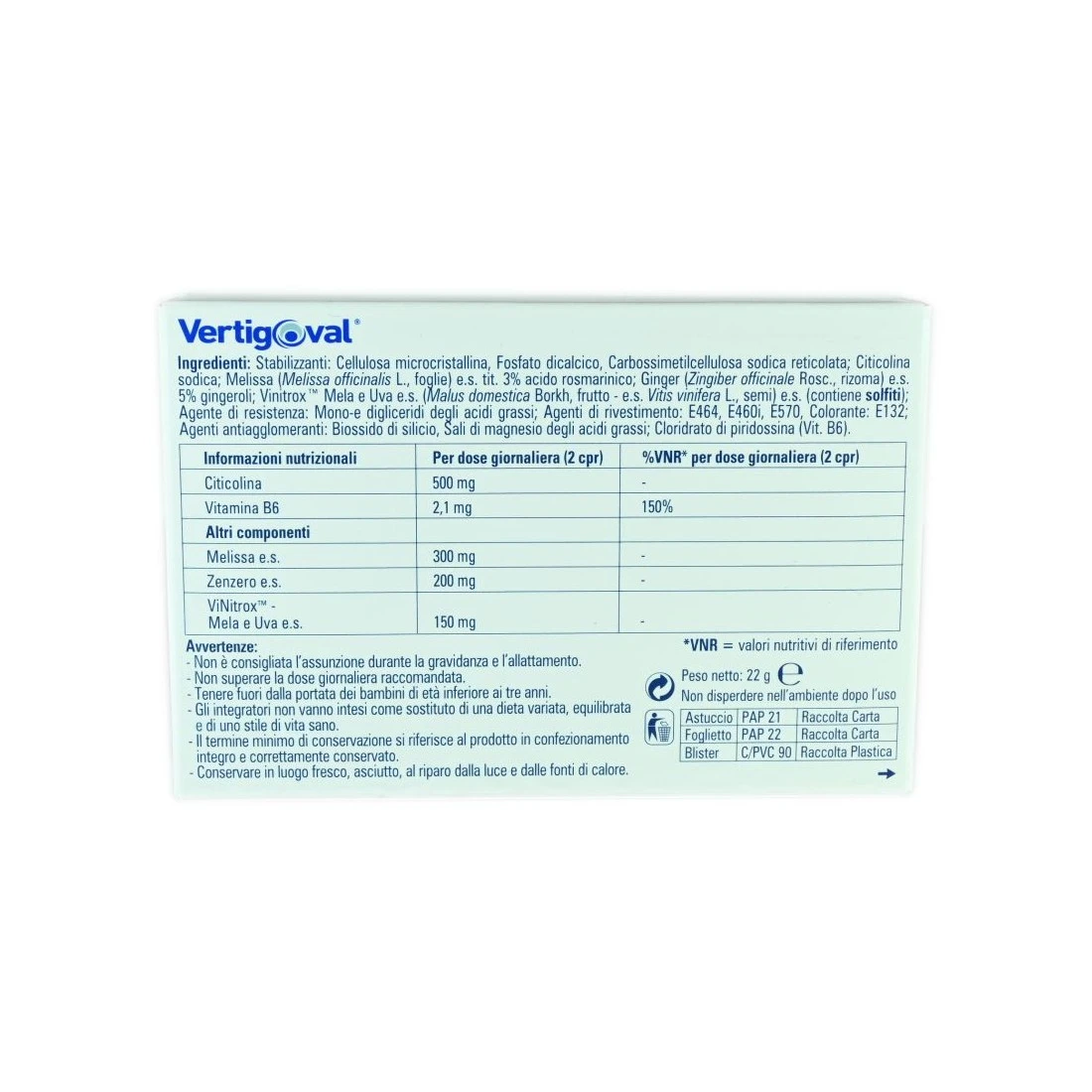 Integratore alimentare a base di citicolina, vitamina B6, zenzero e melissa con ViNitrox, utile come coadiuvante per combattere i disturbi dell’equilibrio di qualsiasi origine e le vertigini.
