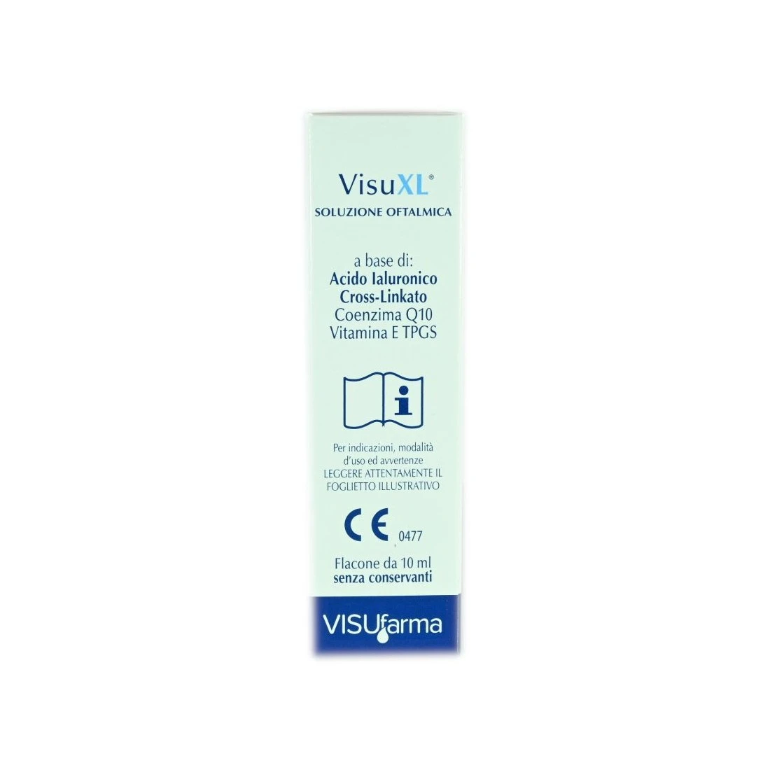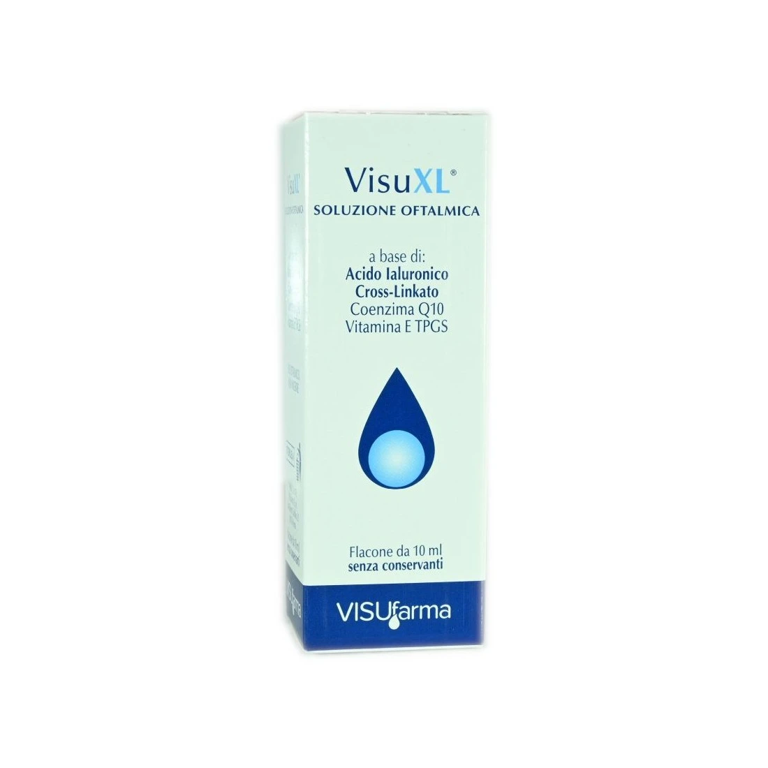 VisuXL è una soluzione oftalmica lubrificante e antiossidante senza conservanti a base di Coenzima Q10, Vitamina E TPGS e Acido Ialuronico sale sodico Cross-Linkato