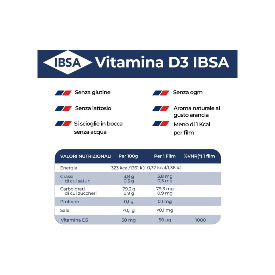 Confezione da 30 film orodispersibili, gusto arancia.