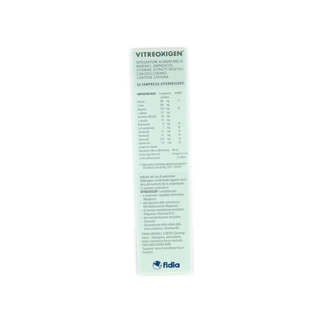 Integratore alimentare a base di minerali, aminoacidi e vitamine, con estratti vegetali. Le sostanze contenute in Vitreoxigen contribuiscono: a mantenere l’equilibrio elettrolitico (magnesio); alla riduzione della stanchezza e dell’affaticamento (magnesio); al normale metabolismo energetico (magnesio e vitamina B12); alla normale funzione muscolare (potassio); alla protezione delle cellule dallo stress ossidativo (vitamina B2 e Panax ginseng).